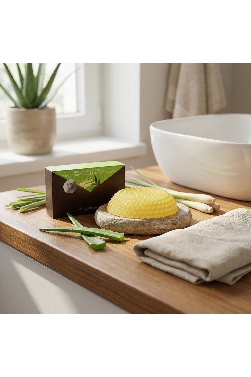 Přírodní ručně vyráběné mýdlo s aloe vera a citronovou trávou. Aloe vera je velmi cenná kosmetická surovina pro své antioxidační a revitalizační účinky. Citronová tráva má zklidňující účinky. Vaši pokožku hydratuje a vyživuje.