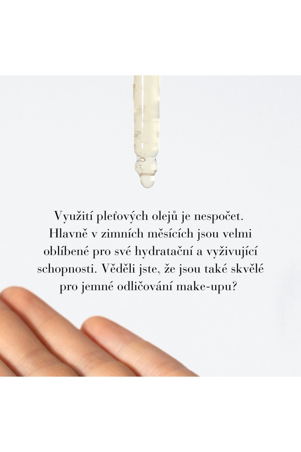 Použití: je vhodný pro každý typ pleti, jako náhrada denních i nočních krémů. Aplikujte přímo na důkladně vyčištěnou pokožku. Doporučujeme použít i jako vlasovou masku nebo k masážím tváře a dekoltu. Olej je vhodný také pro ekzematiky. Před použitím protřepejte.