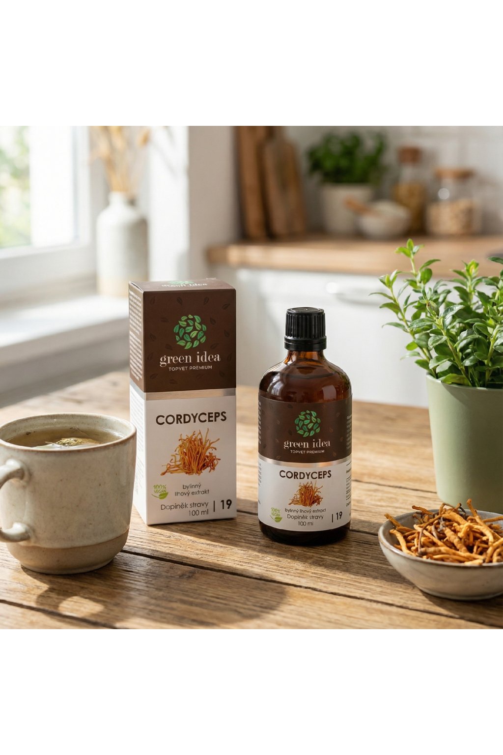 Složení: voda, jemný líh (minimálně 35 obj. % alk./ethanolu), Glycerin, Cordyceps sinensis standardizovaný extrakt z celé houby (10:1, polysacharidy 40 %), vitamín C (kyselina L-askorbová).