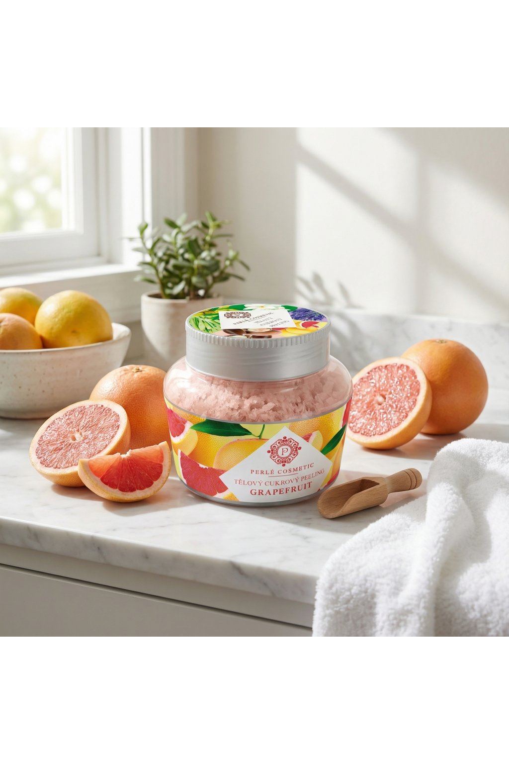 Tělový cukrový peeling jemně odstraní odumřelé kožní buňky. Jemně vyhladí, změkčí a oživí celou pokožku těla. Grapefruitová silice má antimikrobiální účinky a svou vůní osvěžuje při únavě a nervozitě. Tělový cukrový peeling – to je profesionální péče v e vlastní sprše.