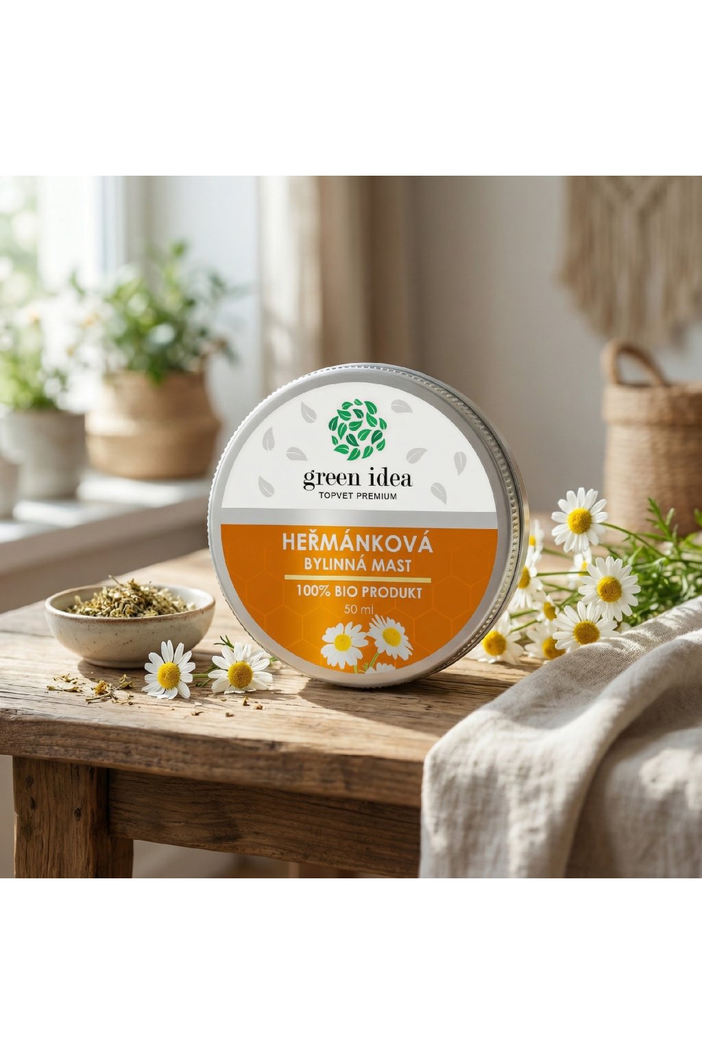 Heřmánek je bylinka bohatá na azuleny, bisabololy a polyfenoly. Heřmánek se tradičně používá pro své zklidňující účinky. Mast se používá k péči o kůži a pro regeneraci poškozené kůže a v oblasti zacelených jizev, je vhodná k péči o prochlazenou nebo rozpraskanou kůži.