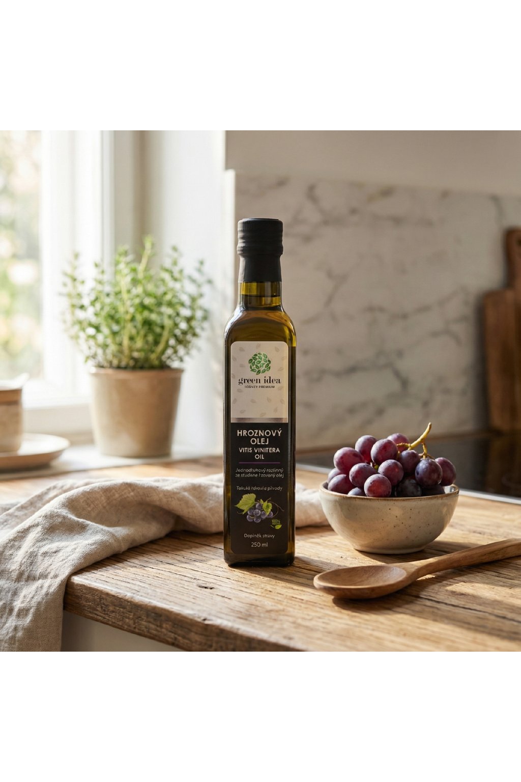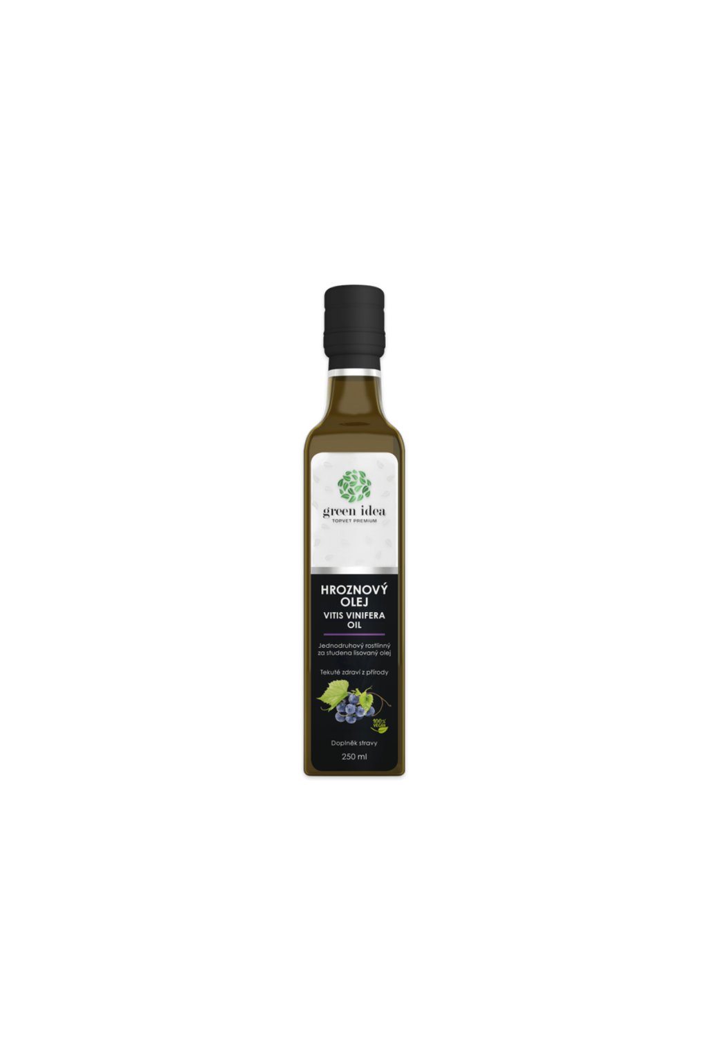 Olej z hroznových jader je bohatý na celou řadu biologicky aktivních látek (zejména oligomerních proantocyanidinů - OPCs). Obsahuje vysoký podíl nenasycených mastných kyselin, které jsou velice důležité pro lidský organizmus. Olej má velmi příjemnou, mírně nasládlou chuť a neutrální mírně oříškové aroma. Přestože Hroznový olej snáší poměrně vysokou teplotu (až 252°C), doporučujeme jej k použití ve studené kuchyni. Olej podporuje normální činnost kardiovaskulárního systému. Vhodný na těžké nohy a úpravu krevního tlaku. Pro normální stav pokožky.