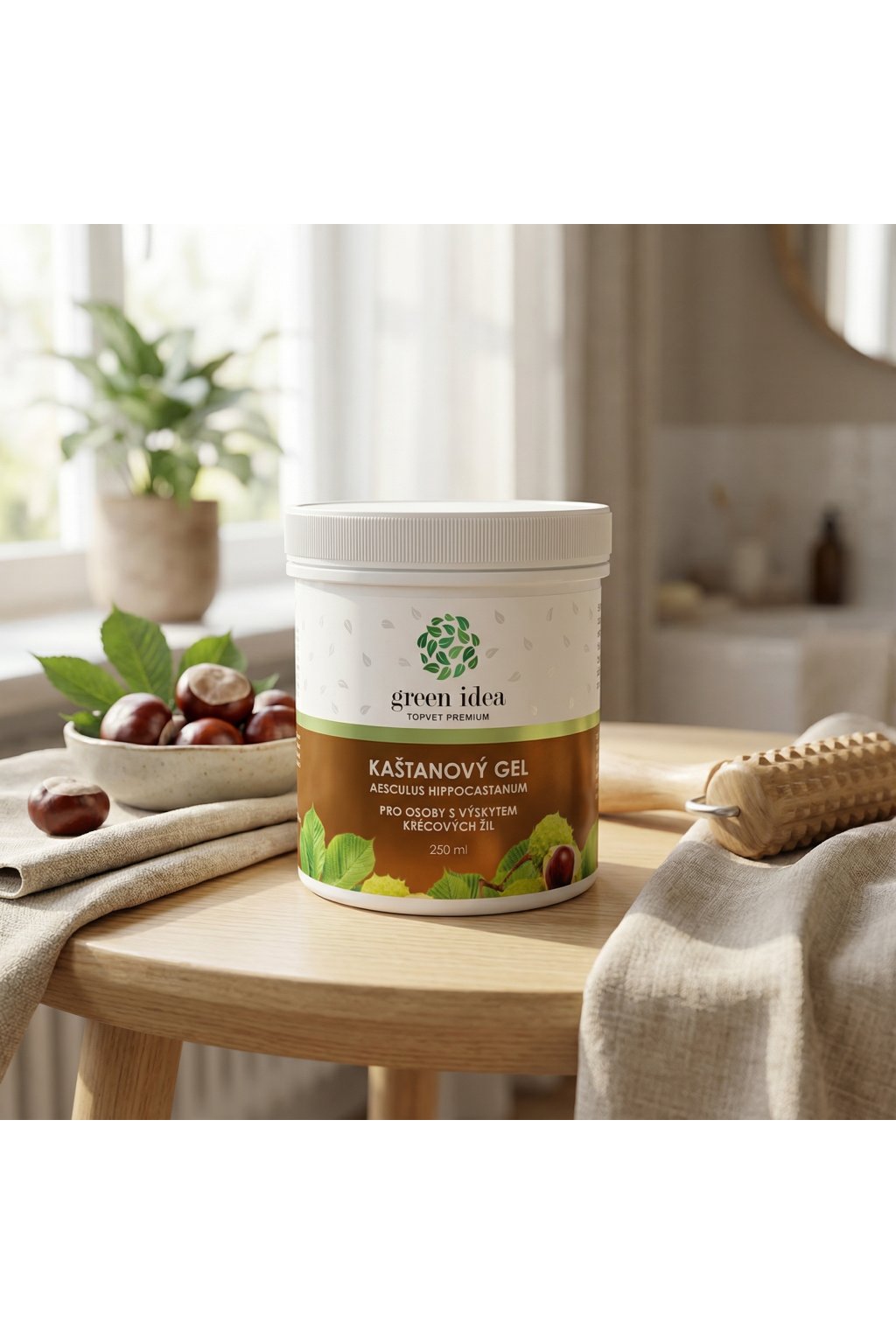 Přípravek na kůži pro osoby s výskytem křečových žil. Jírovec maďal je poměrně mladou léčivkou. Na našem území se objevila až koncem 17. století. Účinnými složkami kaštanu jsou aescin, aesculin, flavonoidní glykosidy a třísla. Užívanými částmi jsou květ, plod, semena a mladá kůra. Aescin má zesilující účinek na žilní stěny a zvyšuje jejich pružnost, pomáhá snižovat otoky. Gel je vhodný k aplikaci ke zklidnění pokožky v oblasti hemoroidů.