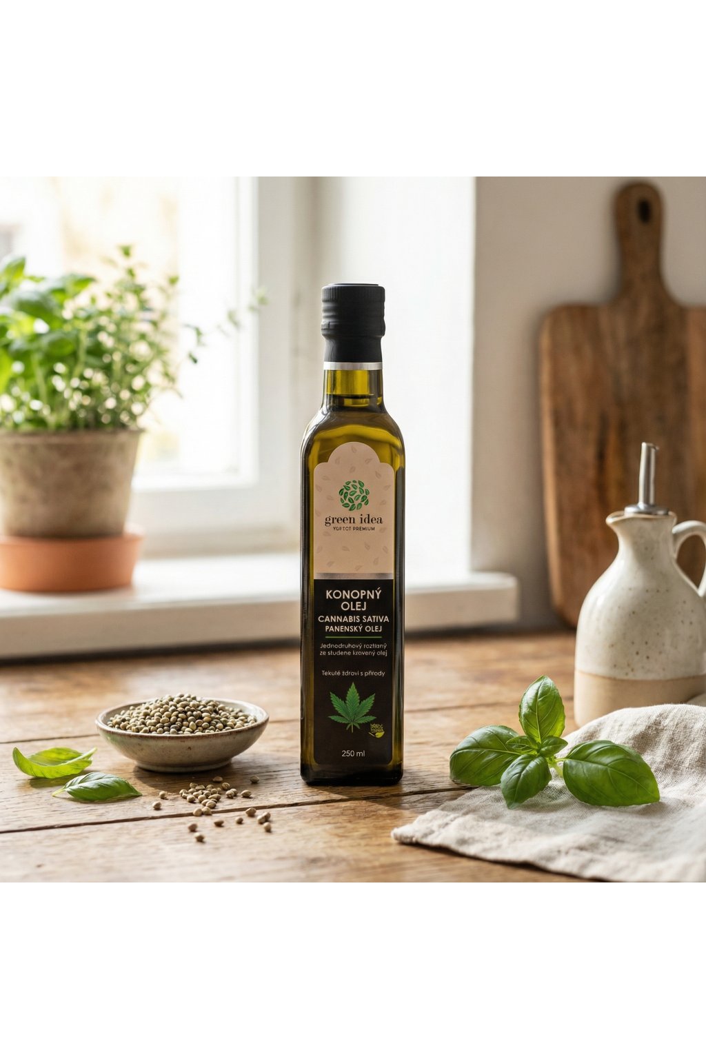 Za studena lisovaný, panenský konopný olej je získáván ze semen konopí, které neobsahují THC. Konopný olej obsahuje unikátní skladbu omega-3 a omega-6 esenciálních nenasycených mastných kyselin, vysoké množství rostlinných sterolů, minerály a vitamíny. Olej má příjemnou, charakteristickou oříškovou chuť i vůni. Olej doporučujeme pro normální činnost srdce. Podporuje přirozenou obranyschopnost a normální stav pokožky. Olej používáme pro jeho protizánětlivý faktor a pro normální hladinu glukózy v krvi.