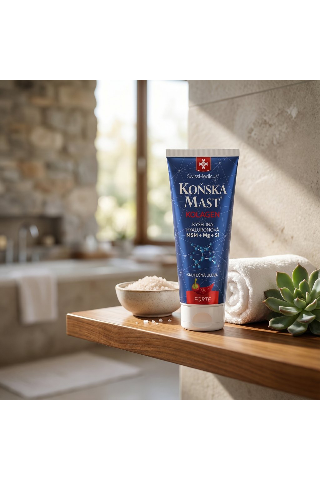 Koňská mast® s mořským kolagenem forte hřejivá je unikátní emulzní gel s mořským kolagenem, kyselinou hyaluronovou a 25 bylinnými a rostlinnými extrakty vyrobený na základě tradiční švýcarské receptury, obohacený o MSM, hořčíkový komplex a bioaktivní křemík z extraktu přesličky rolní. Emulzní gel při masáži rychle vyvolá intenzivní prohřátí. Pro bezbolestný pohyb je nezbytný dobrý stav kloubů včetně kloubního mazu, který zajišťuje jejich hladký chod. Vhodná masáž uvolňuje napětí a omezuje bolestivost svalů a kloubů.