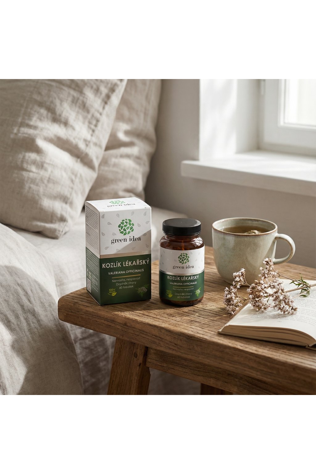 Složení: Kozlík lékařský (Valeriana officinalis) standardizovaný extrakt z kořene (kyselina valerenová 0,8 %), vitamín C (kyselina L-askorbová), mikrokrystalická celulóza (plnidlo), stearan hořečnatý rostlinného původu (plnidlo), vegetariánská kapsle