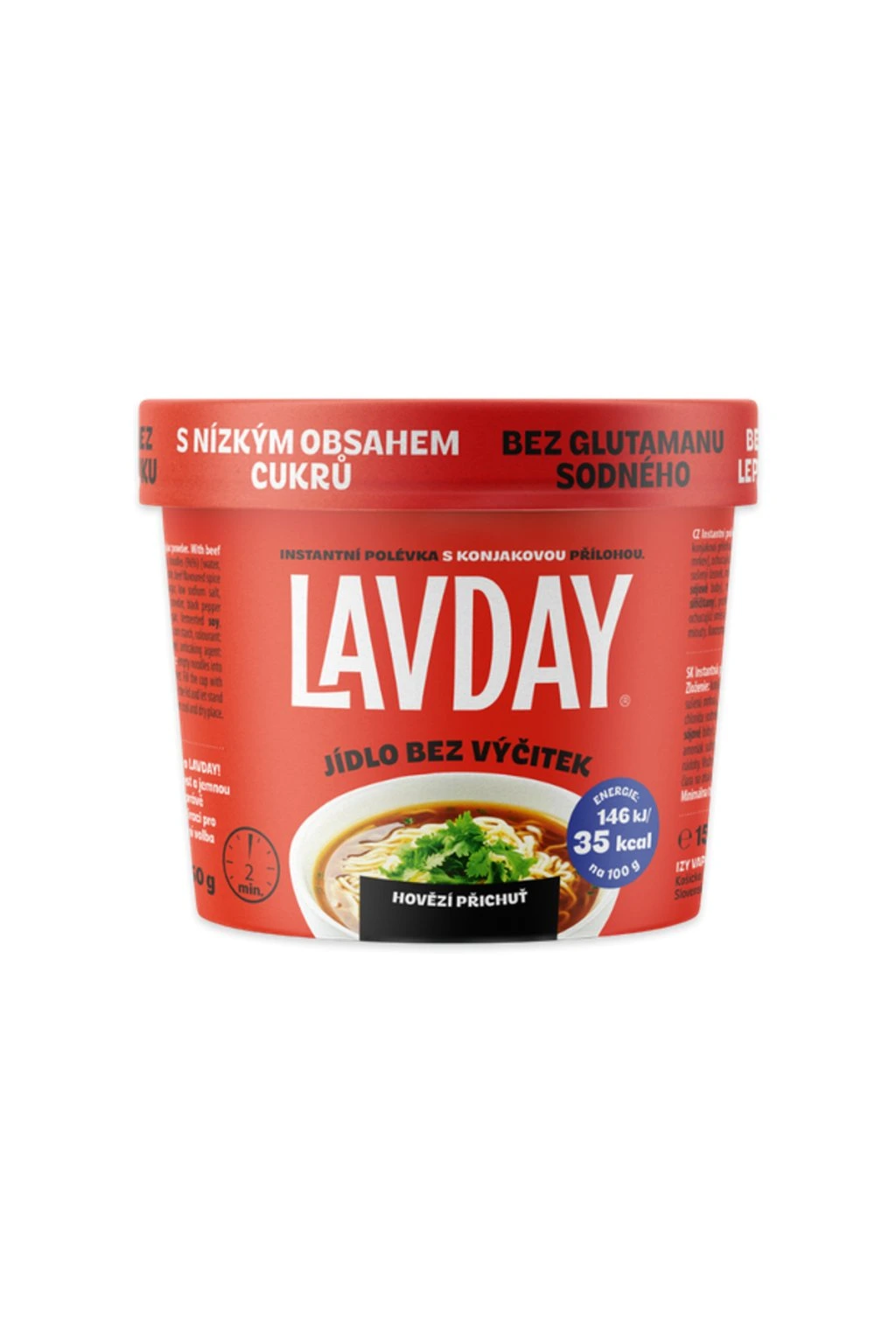 Polévky LAVDAY spojují moderní stravování s chutí, lehkostí a ohledem na zdravý životní styl. Každá porce obsahuje nízkokalorické konjakové nudle a pečlivě připravené ochucovací směsi s autentickými příchutěmi hovězího, kuřecího, zeleninového vývaru, které neobsahují glutaman sodný. Jsou navíc úplně veganské, takže jsou vhodné pro každého, kdo hledá vyváženou a zodpovědnou volbu na každý den. Vyzkoušejte rychlé a chutné jídlo bez výčitek! Tato instantní polévka kombinuje jemné konjakové nudle, vyrobené z přírodního konjakového prášku, se pečlivě sladěnou směsí koření s hovězí příchutí. Výjimečně lehká, plná chutí a připravená za pár minut – ideální volba pro rychlý oběd či večeři. Konjakové nudle s nízkým obsahem kalorií a vlákninou vás zasytí bez zbytečných kalorií, zatímco ochucující směs probudí vaše chuťové pohárky. Jídlo, které je nejen lahodné, ale i jednoduché na přípravu.