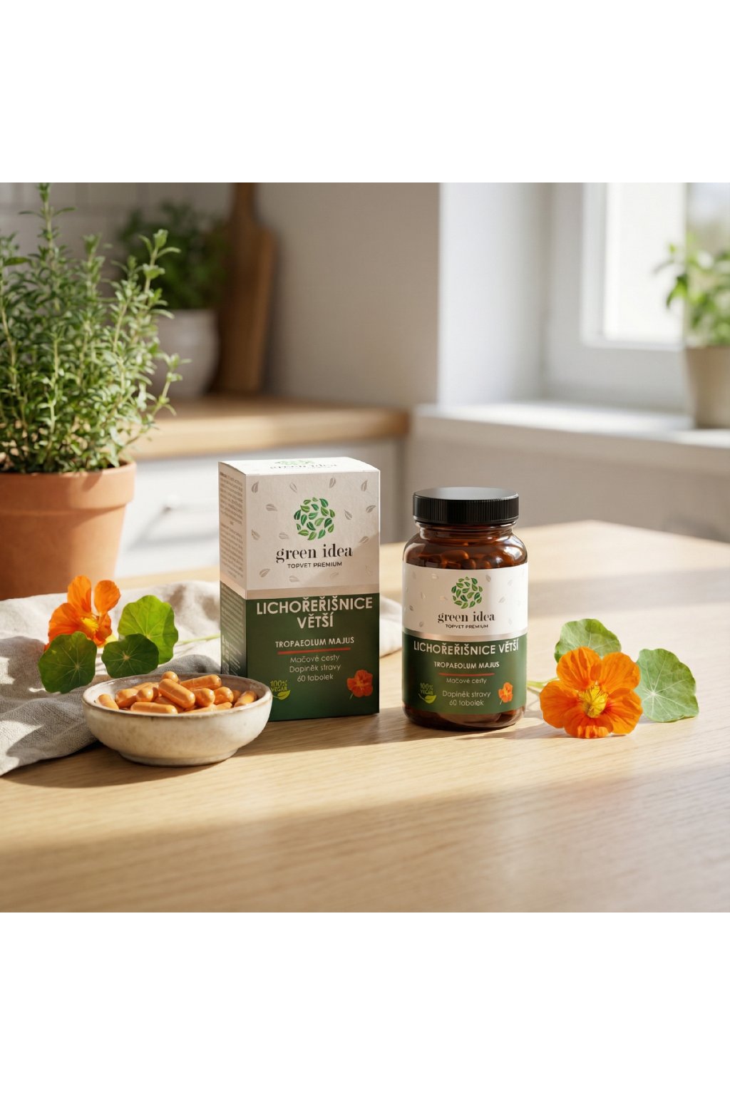 Složení: Lichořeřišnice větší (Tropaeolum majus) extrakt z celé rostliny (10:1), vitamín C (kyselina L-askorbová), mikrokrystalická celulóza (plnidlo), stearan hořečnatý (plnidlo), vegetariánská kapsle.