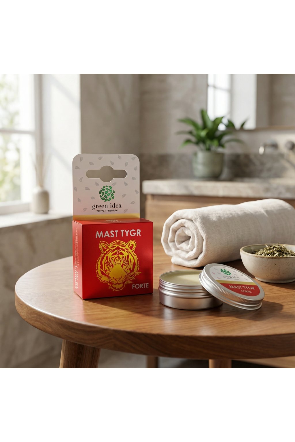 Mast TYGR FORTE je velice silná, díky základu z vazelíny zůstává dlouho na pokožce, kde intenzivně účinkuje a voní. Obsahuje přírodní silice (máta, kajeputový olej, bazalka, hřebíček, skořice, eukalyptus), kafr a menthol, jejichž vůně a zahřívací efekt mají vliv na uvolnění napětí.