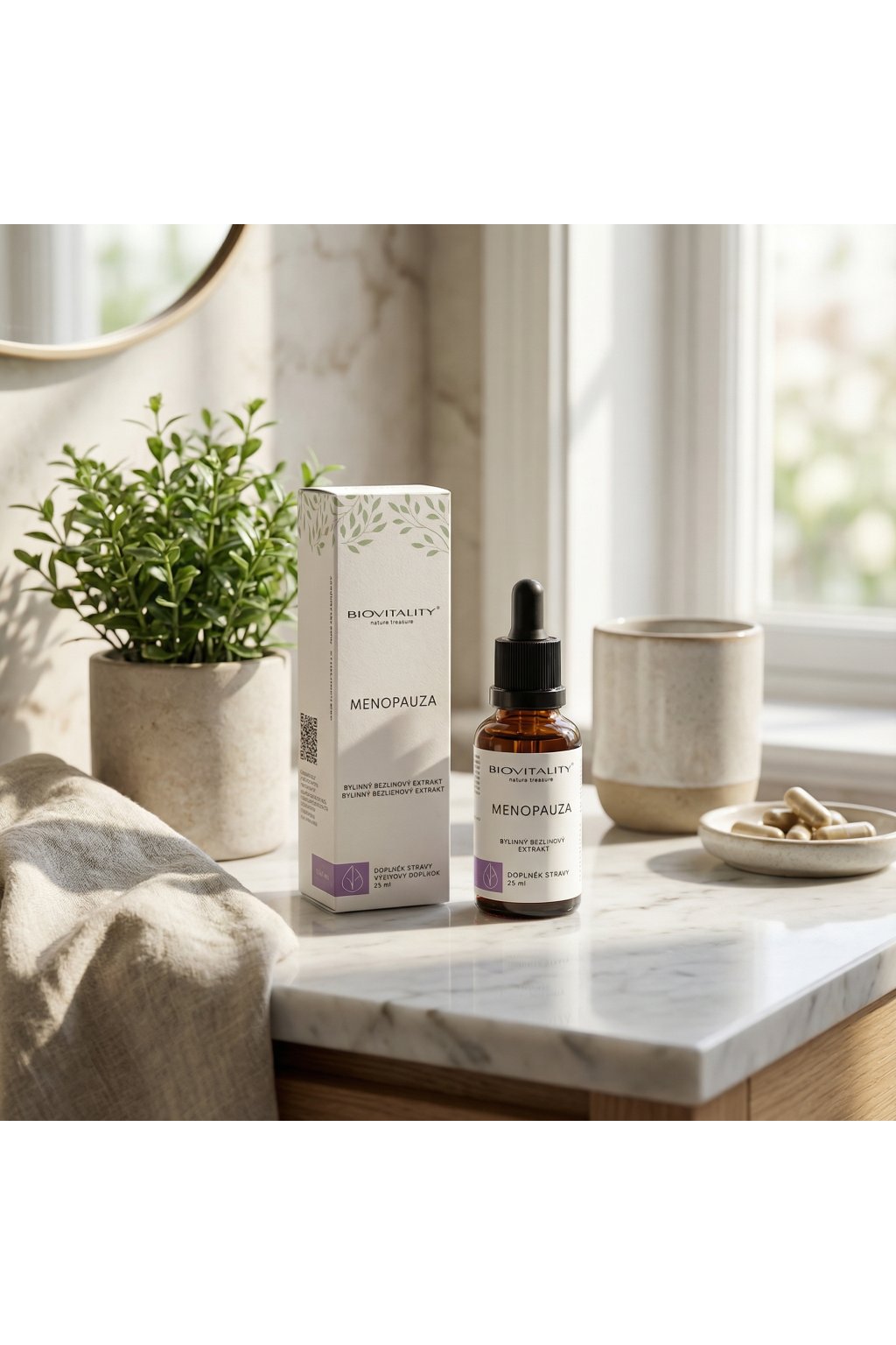Zmírněte projevy menopauzy s naším bylinným přípravkem. Pečlivě vybrané složení pro podporu hormonální rovnováhy, úlevu od návalů horka a podporu klidného spánku. Přirozeně podporuje vaše tělo během přechodu, pro pocit pohody a energie.