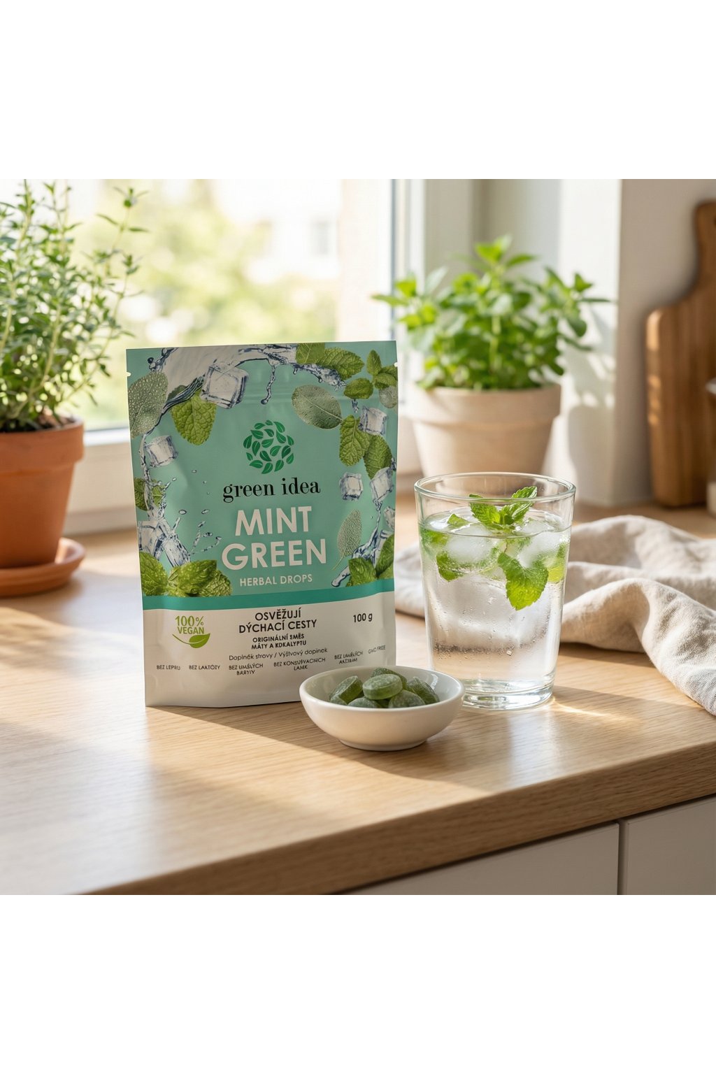 Bylinné bonbóny Mint green obsahují extrakt z máty a esenciální oleje z eucalyptu a máty, které osvěžují hrdlo a krk, omezují zápach z úst. Mají harmonickou chuť, osvěží dech a přispějí k normální funkci dýchacích cest.