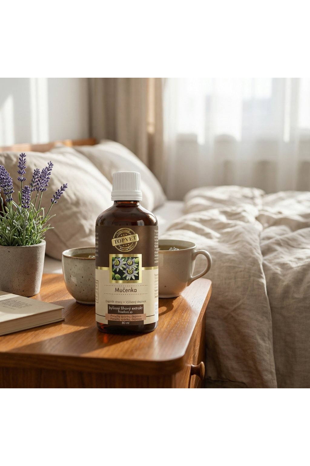Složení: voda, jemný líh (minimálně 35 obj. % alk./ethanolu), Mučenka (Passiflora sp.) standardizovaný extrakt z květu (rozmarýnová kyselina 2 %), vitamín C (kyselina L-askorbová).