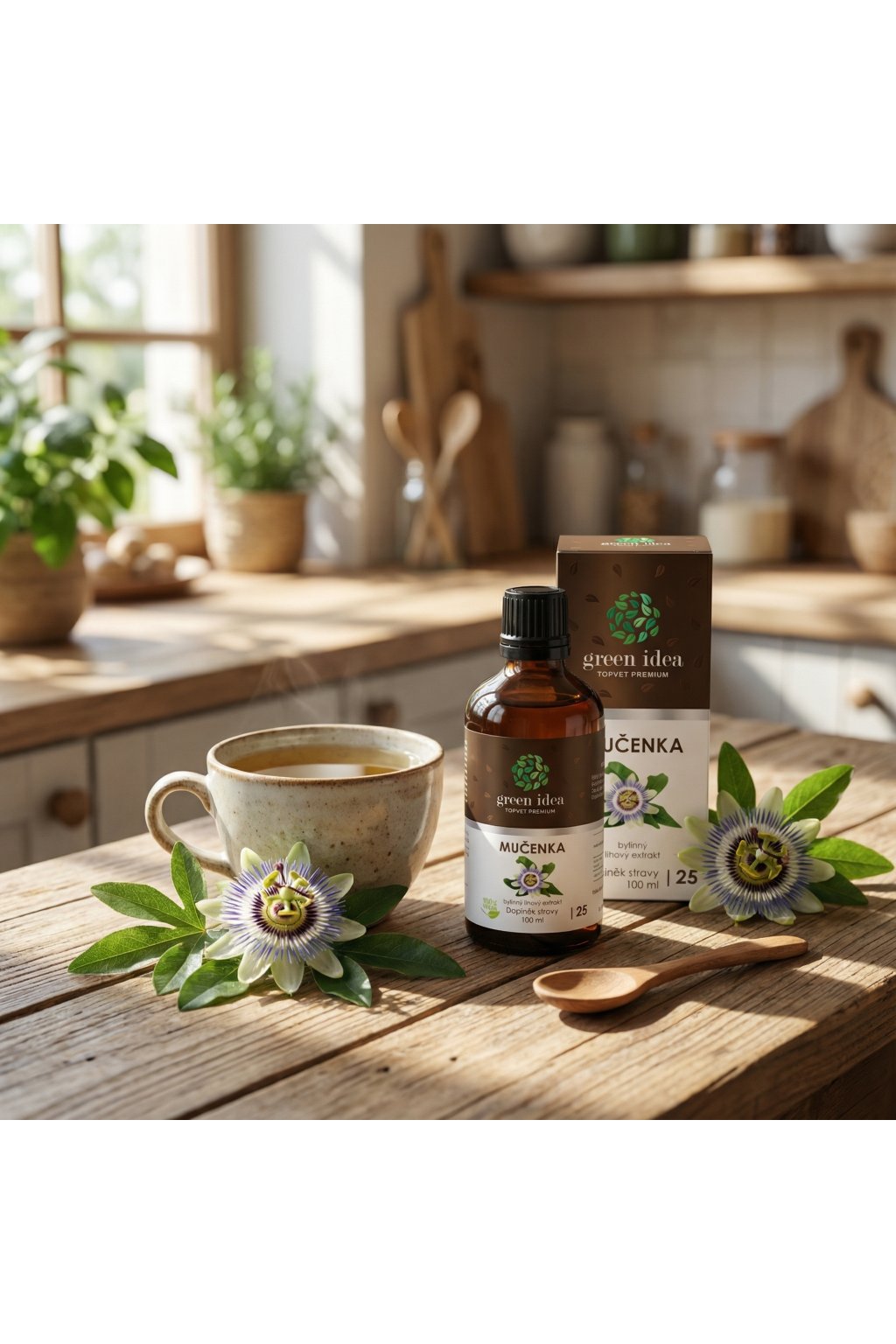 Složení: voda, jemný líh (minimálně 35 obj. % alk./ethanolu), Mučenka (Passiflora sp.) standardizovaný extrakt z květu (rozmarýnová kyselina 2 %), vitamín C (kyselina L-askorbová).