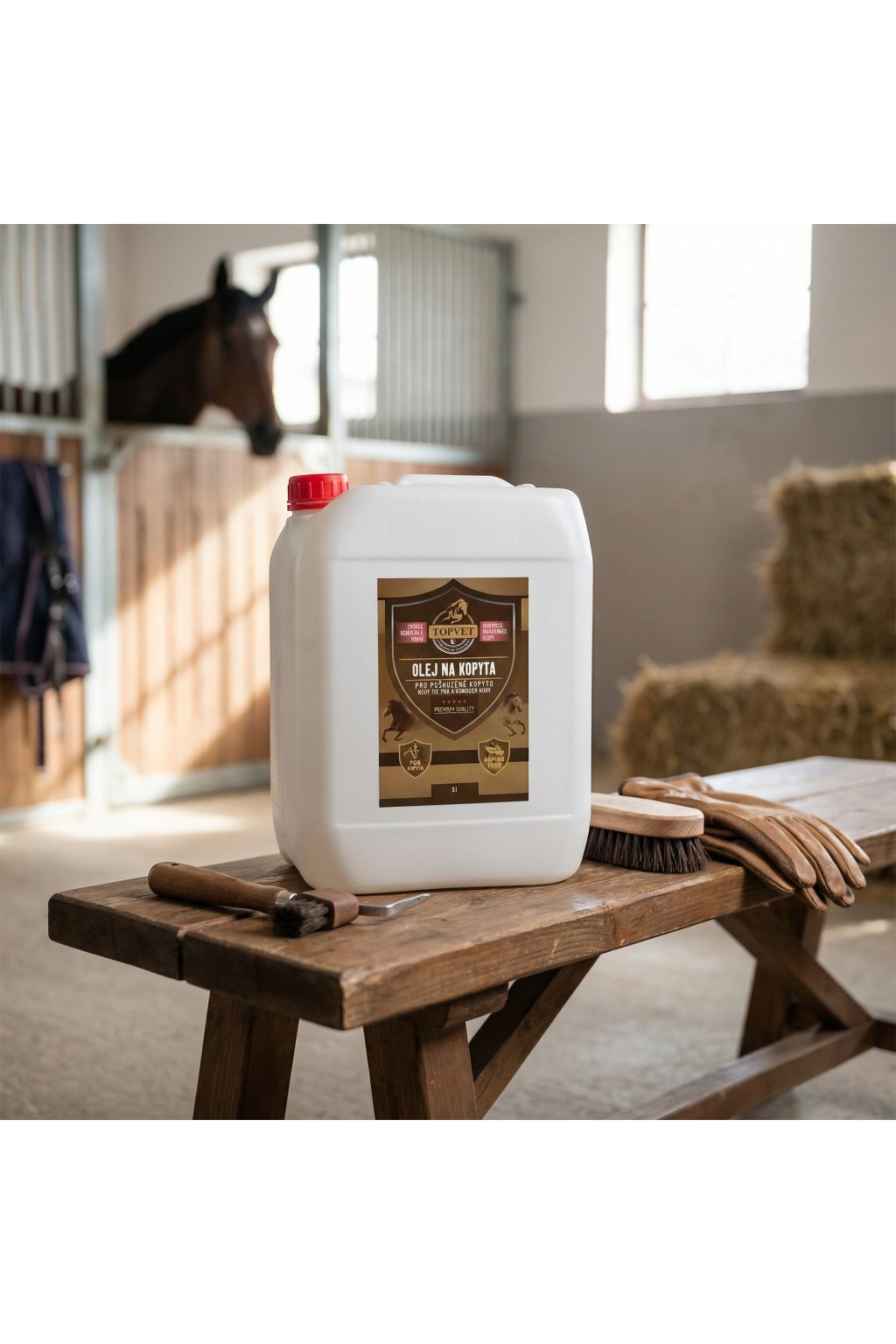 Olej na kopyta je určený pro koně s poškozeným kopytem. Originální receptura kopytní tkáň vyživuje, hojí a regeneruje. Kopyto je po použití zdravé, elastické a připravené na vysokou zátěž. Směs luxusních olejů díky vysokému obsahu nenasycených mastných kyselin přirozeným způsobem vyživuje a regeneruje. Směs vosků kopyto chrání. Směs silic vykazuje silný antiseptický a hojivý účinek.