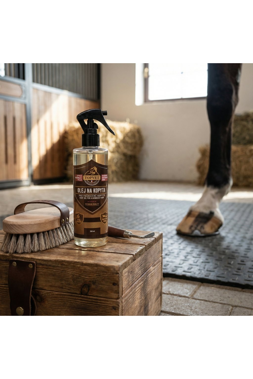 Olej na kopyta je určený pro koně s poškozeným kopytem. Originální receptura kopytní tkáň vyživuje, hojí a regeneruje. Kopyto je po použití zdravé, elastické a připravené na vysokou zátěž. Směs luxusních olejů díky vysokému obsahu nenasycených mastných kyselin přirozeným způsobem vyživuje a regeneruje. Směs vosků kopyto chrání. Směs silic vykazuje silný antiseptický a hojivý účinek.