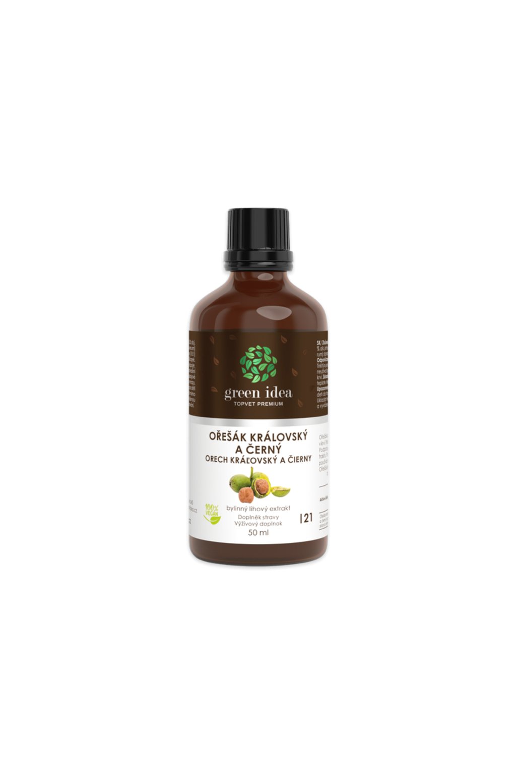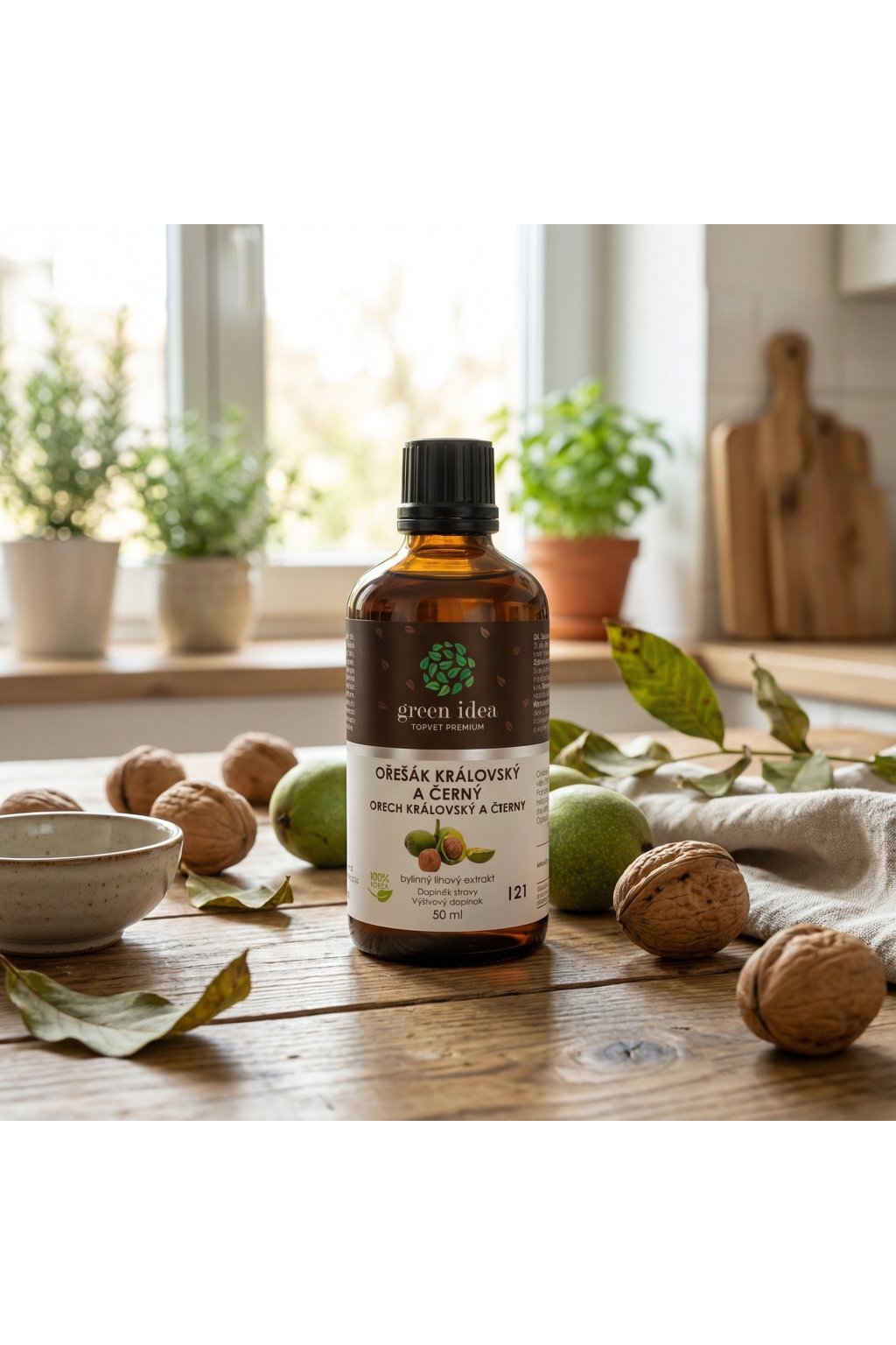 Složení: voda, jemný líh (minimálně 35 obj. % alk./ethanolu), Glycerin, Ořešák královský a černý (Juglans regia et nigra) extrakt z pupenů (10:1).