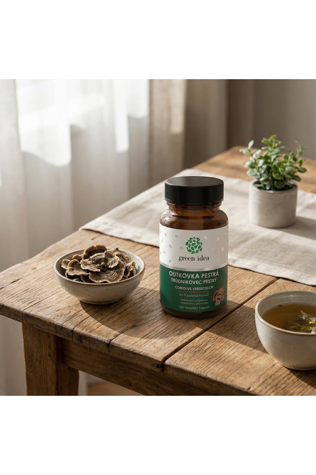 Složení: Outkovka pestrá (Coriolus versicolor) stand. extrakt z nadzemní části (50 % polysacharidů), vegetariánská kapsle