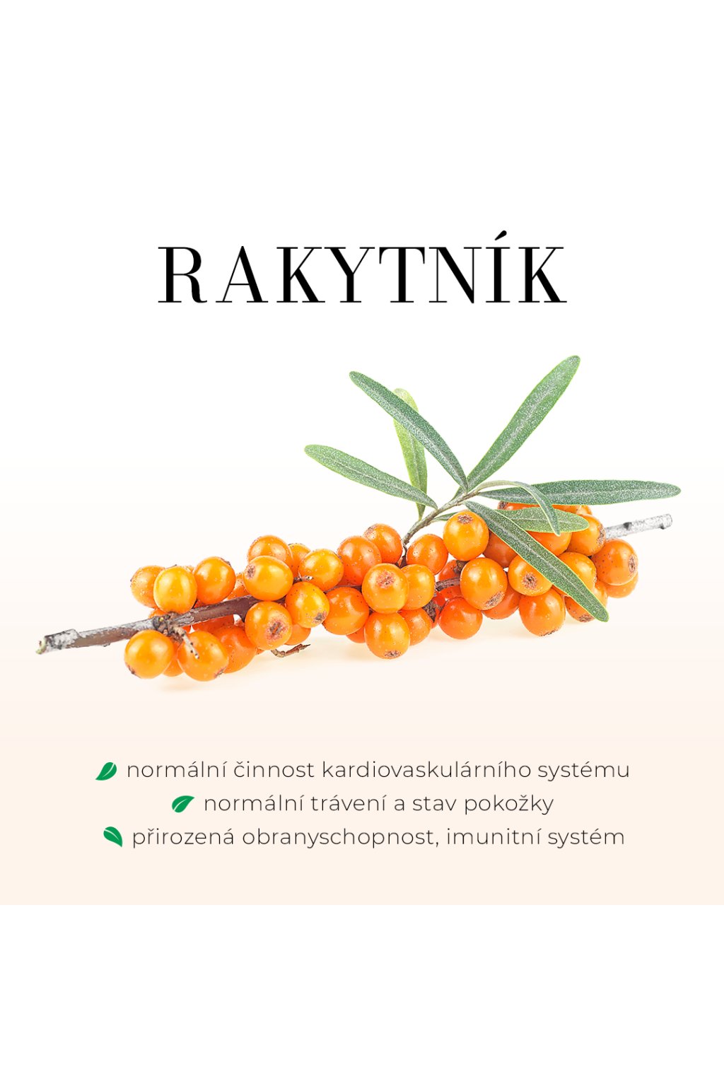 Rakytník řešetlákový - Hippophae Rhamnoides je bylina s velmi širokým spektrem účinku. Je velice bohatý na vitamín C, mastné kyseliny, stopové prvky a další cenné látky. Rakytník pomáhá chránit před oxidačním stresem, posiluje přirozenou obranyschopnost organismu. Podporuje normální funkci imunitního, kardiovaskulárního a trávicího systému. Navozuje stav klidu, snižuje úzkost.