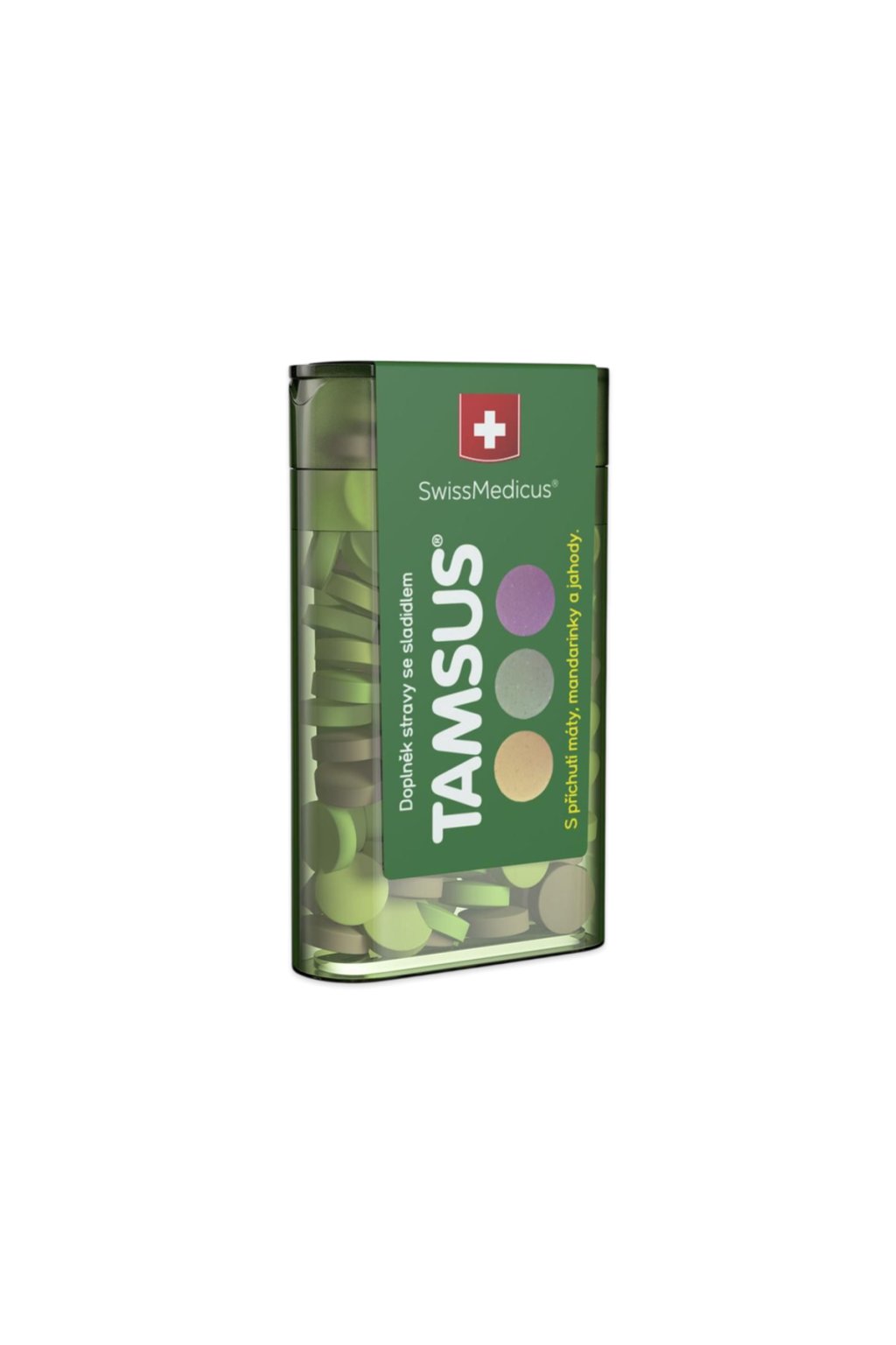 Tamsus je doplněk stravy se sladidlem, s vápníkem a se sladidly rostliny stévie, s příchutí máty, mandarinky a jahody. Obsahuje pH neutralizační vápenatou sůl. Vápník přispívá k normální funkci trávicích enzymů.