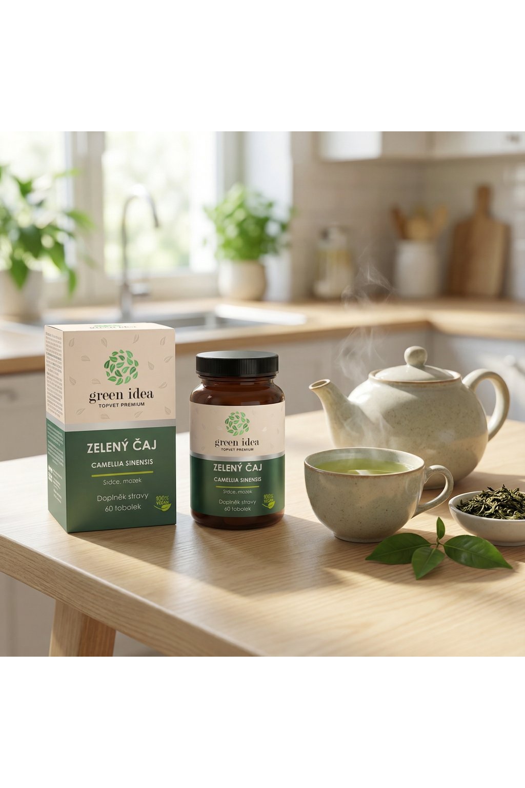 Složení: Zelený čaj (Camellia sinensis) standardizovaný extrakt list, vitamín C (kyselina L-askorbová), mikrokrystalická celulóza (plnidlo), tobolka (rostlinná želatina)