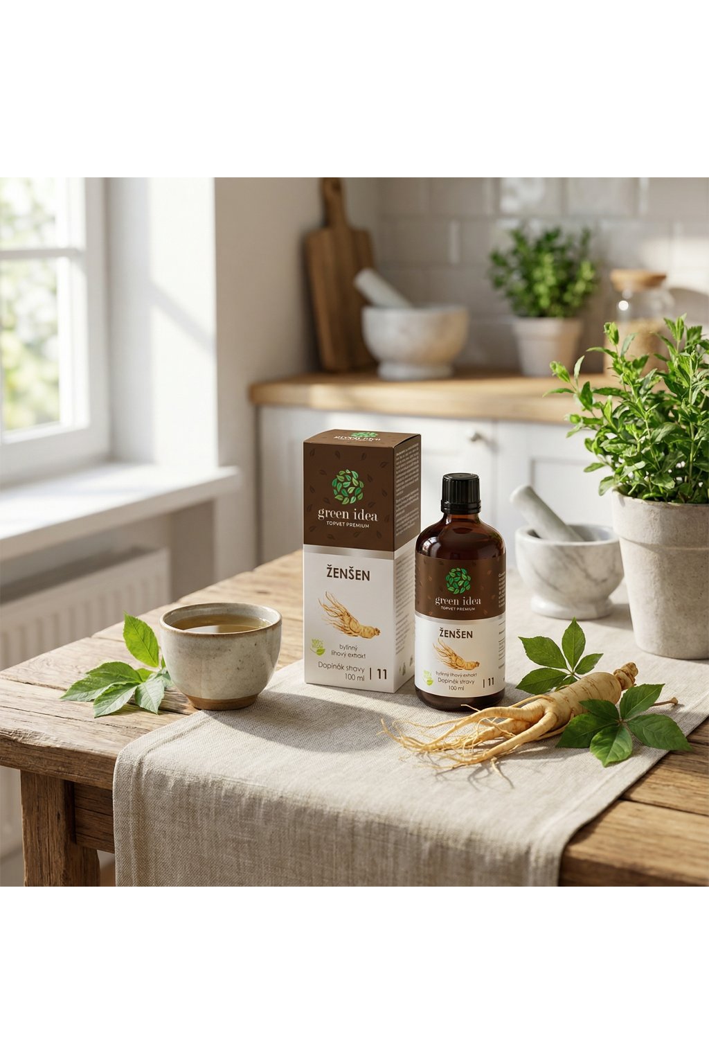 Složení: voda, jemný líh (minimálně 35 obj. % alk./ethanolu), Žen-šen (Panax ginseng) standardizovaný extrakt z kořene (ginsenosidy 25 %), vitamín C (kyselina L-askorbová).