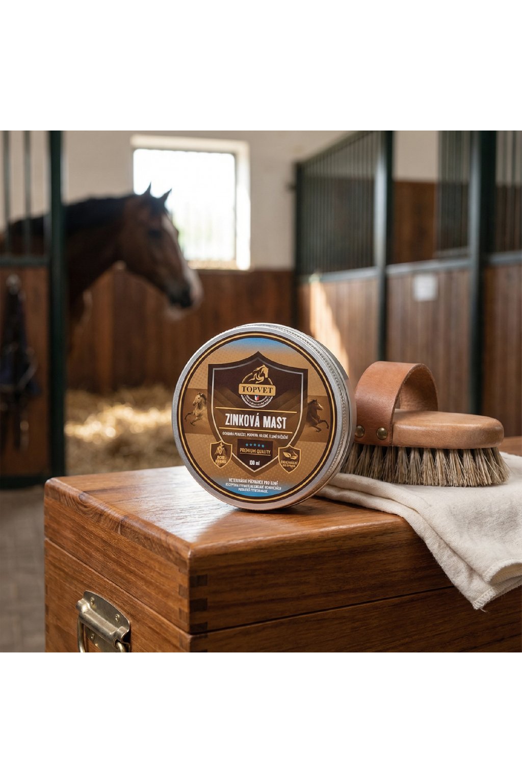 Zinková mast je určena pro koně s kožními problémy. Je obohacená o složky, které pokožku vyživují, hydratují a zabraňují vysoušení a praskání. Podporuje hojení a regeneraci kůže. Vhodná k použití na podlomy, na podrážděnou a svědivou pokožku. Zklidňuje a redukuje zarudnutí. Poskytuje ochranu proti drsným povětrnostním podmínkám a napomáhá při léčbě drobných poranění.